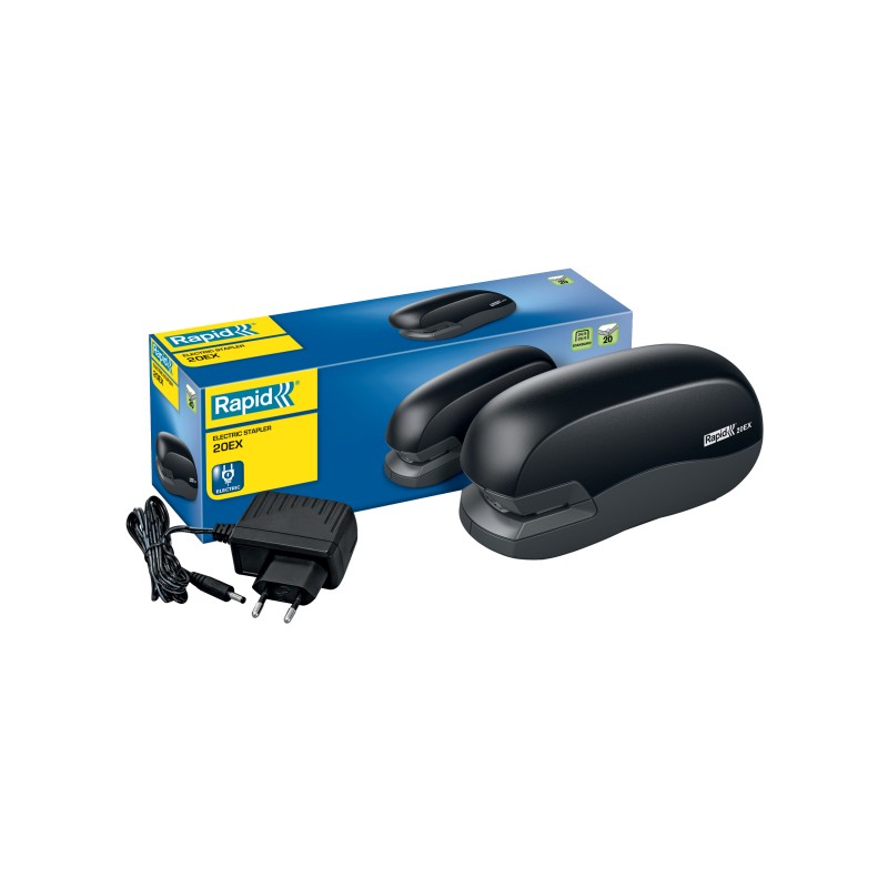 Mały zszywacz biurowy Rapid 20EX, zasilany przez zasilacz sieciowy (zasilacz w komplecie). Nowoczesny wygląd i solidne wykonanie sprawiają, że zszywacz Rapid 20EX jest funkcjonalnym i estetycznym uzupełnieniem każdego biurka. Idealny do zszywania cienkich plików, np. w bankach, aptekach, hotelach.